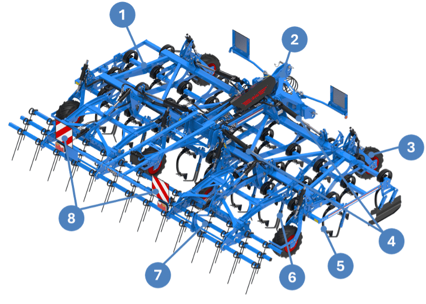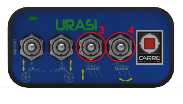 L’URASI bénéficie de 4 tubes porte-dents en tube carré 70mm HLE (Haute Limite Elastique) afin de réduire le nombre de dents sur un même tube. Ils sont pourvus de dents 80×12 avec contre ressort. Tous les modèles sont pourvus de 6 roues de contrôle (2 roues à l’avant et 4 roues à l’arrière) qui permettent de régler le talonnage et la profondeur de l’outil. Toutes les roues sont réglables hydrauliquement à partir de la cabine grâce au boîtier de commande. Il est possible de rajouter une herse peignes triple afin de maximiser la décomposition des adventices.