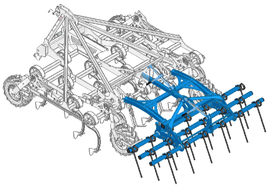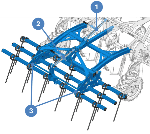 Trois rangées de peignes Ø13 avec un espacement de 450mm et un pas de 150mm pour garantir un travail intensif tout en conservant un flux optimum. La herse peignes triple nivèle et favorise la décomposition des résidus avec la mise à nu du racinaire en surface.