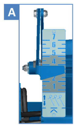 La hauteur se règle par le bouton (3) qui agit sur le vérin (1). Une réglette graduée (A) permet de repérer la profondeur de travail.