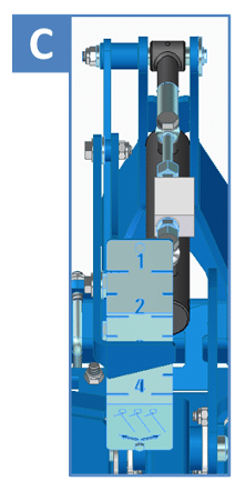 L’agressivité se règle par le bouton (4) qui agit sur le vérin (2). Une réglette graduée (C) permet de repérer l’inclinaison.