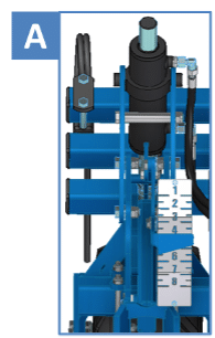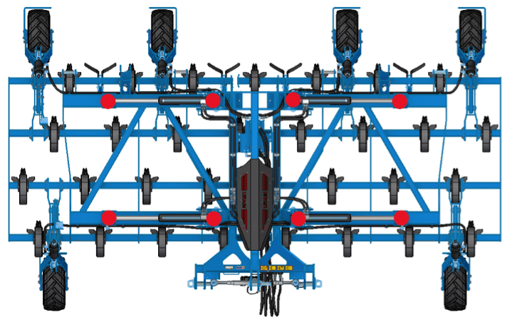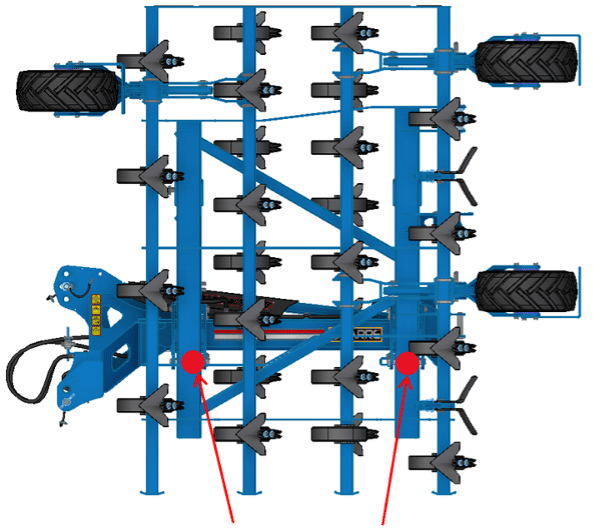 Les marqueurs rouges indiquent tous les points de graissage de la machine. Un graisseur est aussi présent sur les paliers de roues de contrôle (1 palier de chaque côté de la roue)