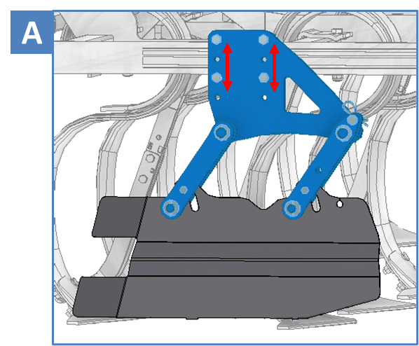 La paire de déflecteur latéraux se règle suivant la profondeur de travail et doit être régler pour effleurer le sol. Deux positions sont possibles (A). En cas d’important résidus une position escamotée est possible (B).